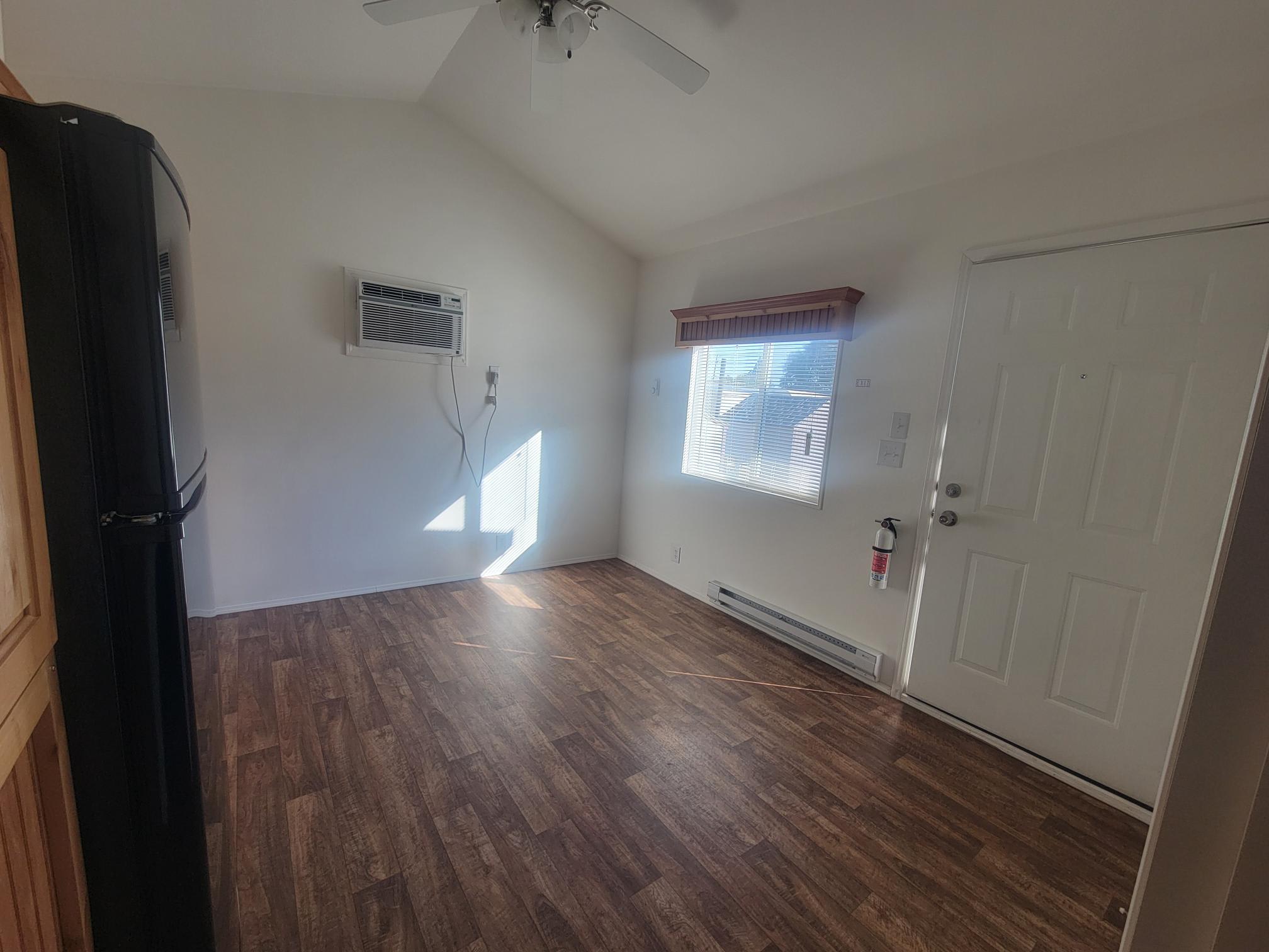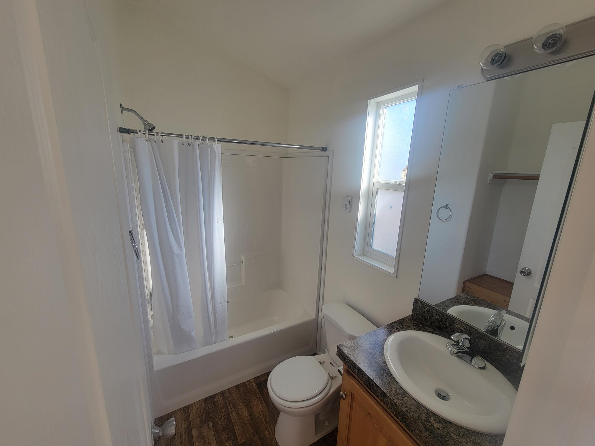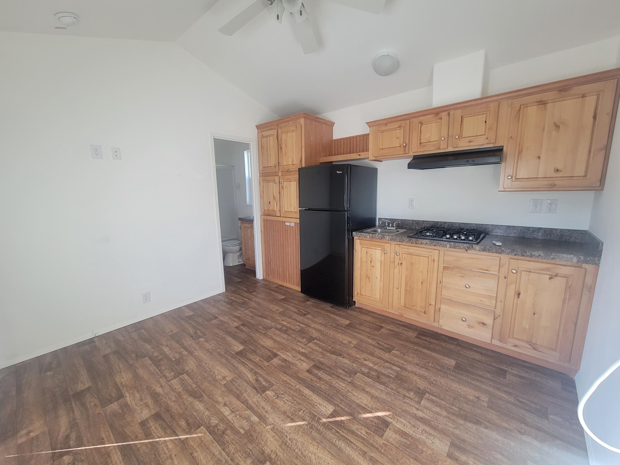 This space features a functional kitchen cooktop, sleeping space, tub and shower combo, and ample natural light. Ideal for anyone seeking a simple, affordable home without sacrificing comfort.